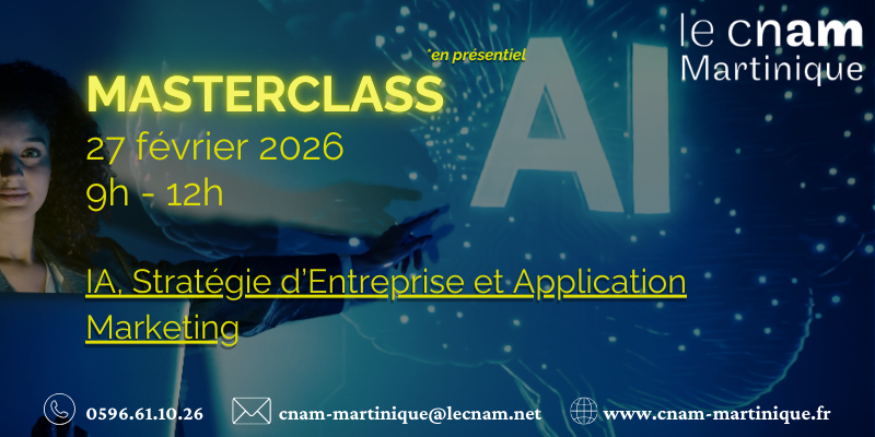 Masterclass Formez-vous à l'IA, la compétence incontournable de demain. Vendredi 27 février 2026 De : 9h à 12h Adresse : Schoelcher Immeuble Marguerite ALPHA Anse Madame -97233 Schoelecher.